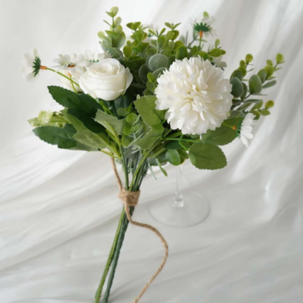 Soft greenery is essential: eucalyptus, olive branches, dusty green leaves