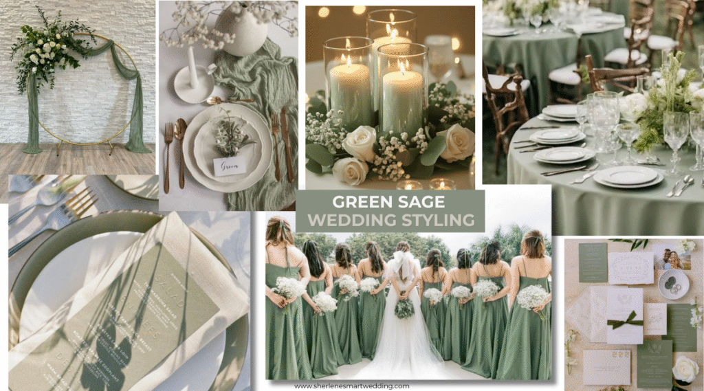 A curated visual space featuring cohesive wedding styling ideas inspired by soft sage green tones — calm, elegant, and modern.